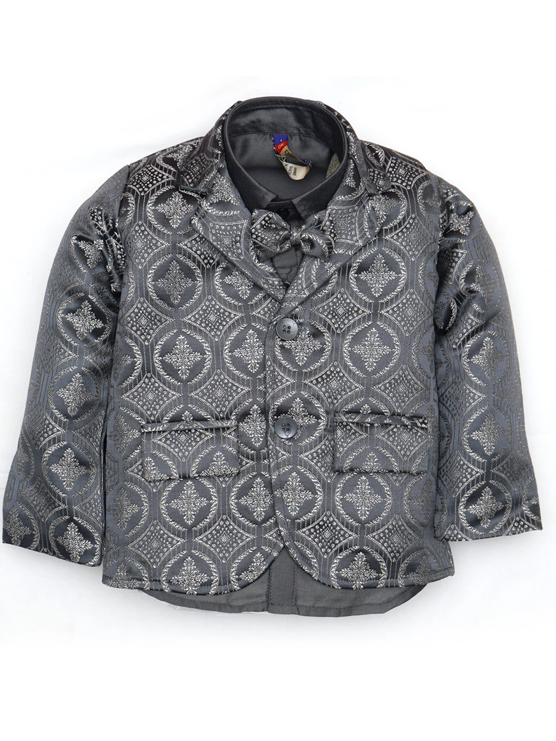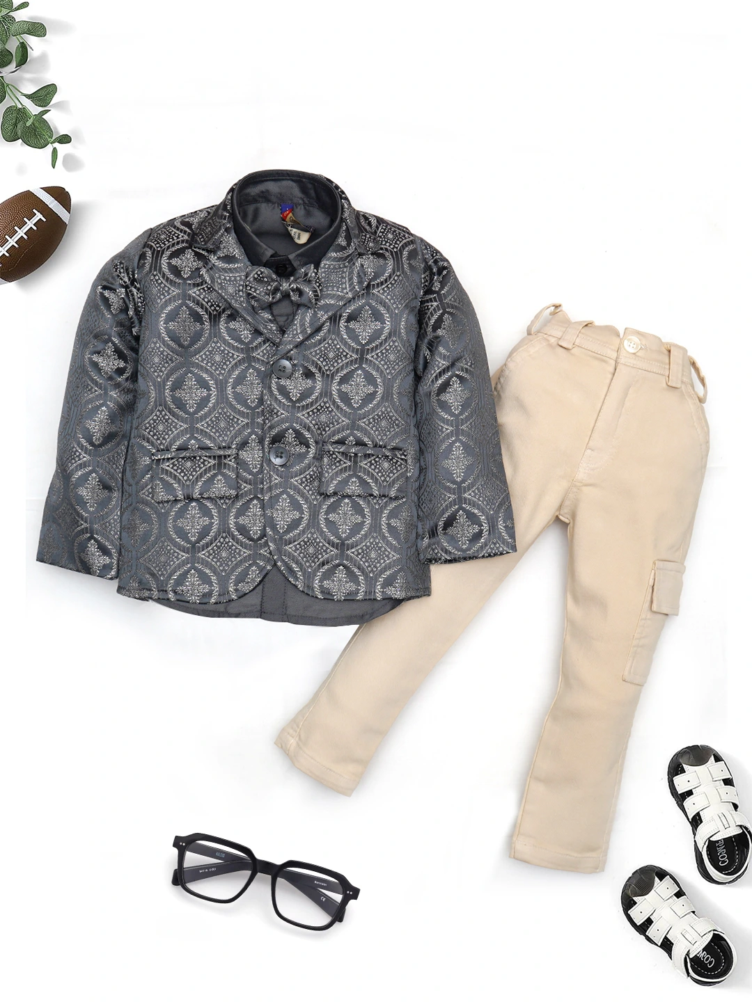 Elevate your child’s festive style with this unique boys’ ethnic party wear set, featuring a grey printed jacket and matching bow tie, paired with beige pants. The jacket’s intricate pattern and traditional look makes it perfect for celebrations, festivals, and cultural events. The pant is designed for all-day comfort and style, completing an ensemble that blends modern trends with classic elegance.