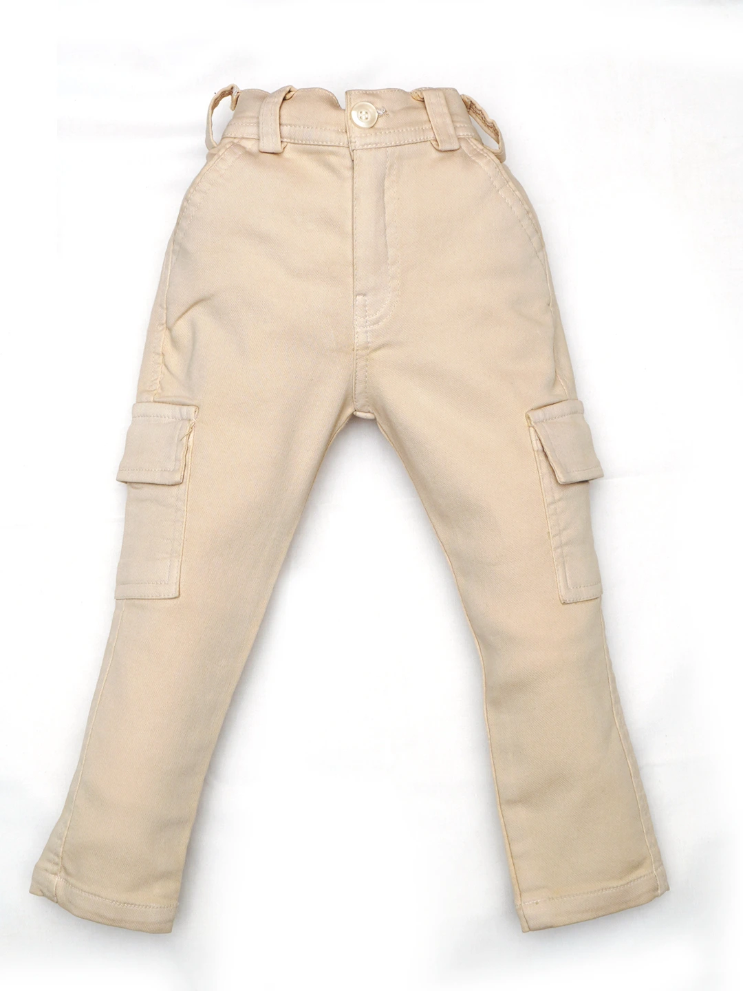 Pants: Solid beige color, classic fit, belt loops, button closure, side pocket