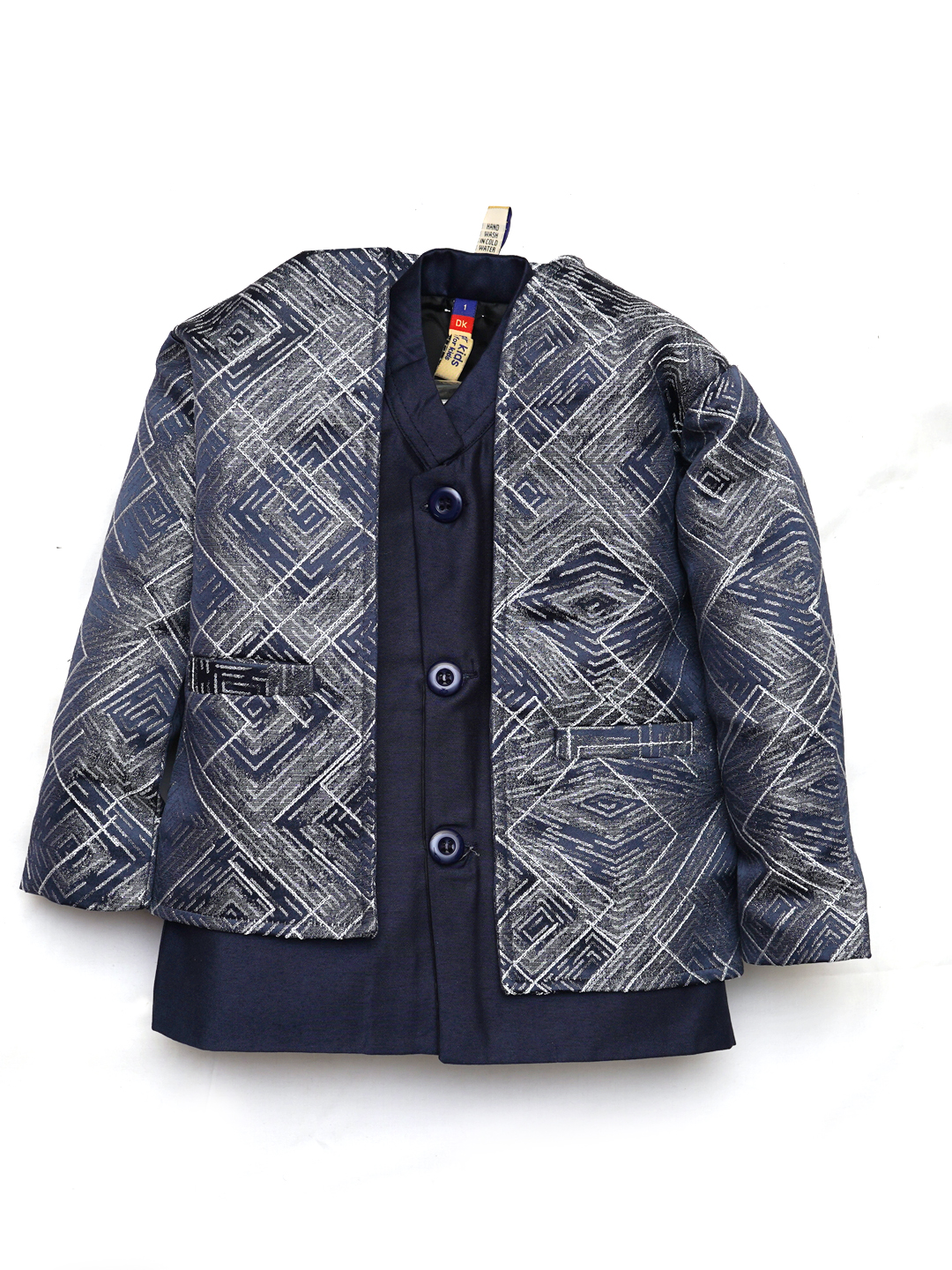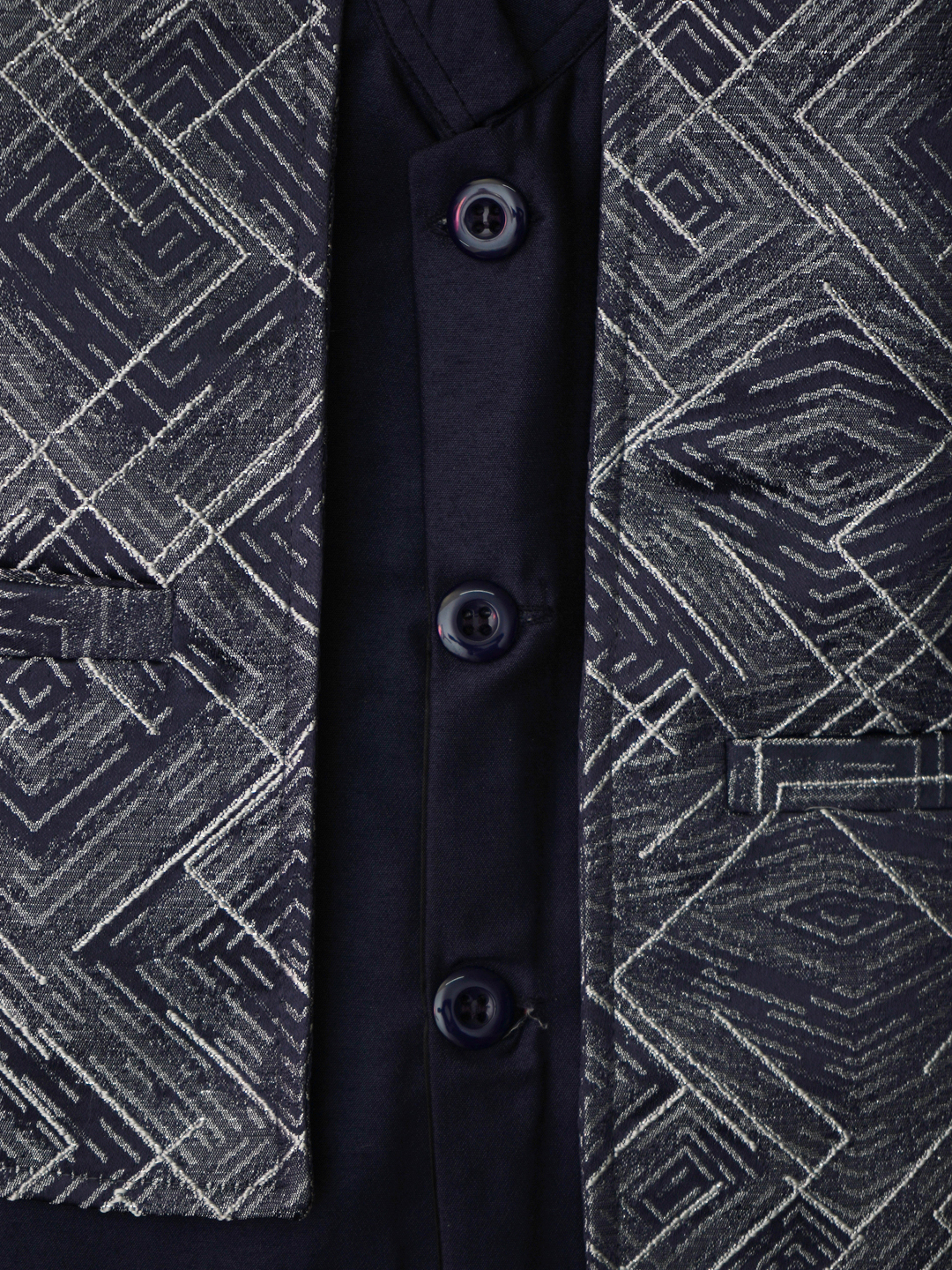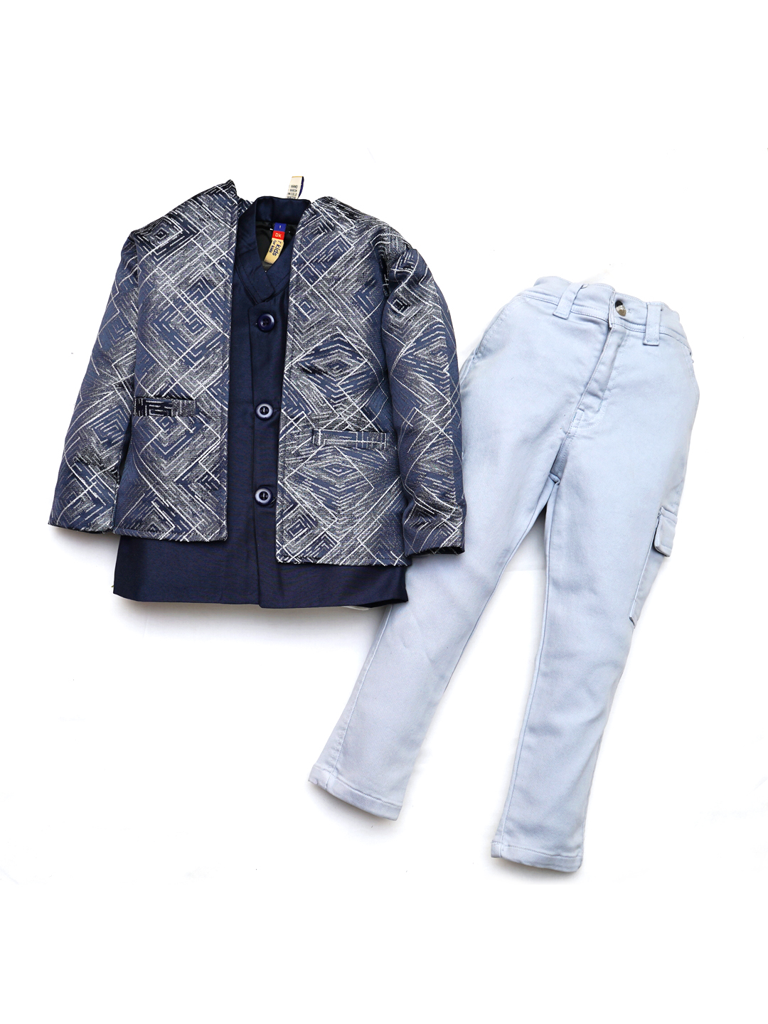 This elegant set includes a navy blue geometric-patterned blazer, matching inner shirt, and light blue straight-fit pants designed for boys. Crafted from a comfortable cotton blend, the outfit achieves both style and comfort for festive occasions and formal gatherings. The jacket features a single-breasted closure, modern geometric print, and convenient front pockets. The sky blue trousers feature belt loops, a zip-button closure, and a practical side cargo pocket for a contemporary twist.
