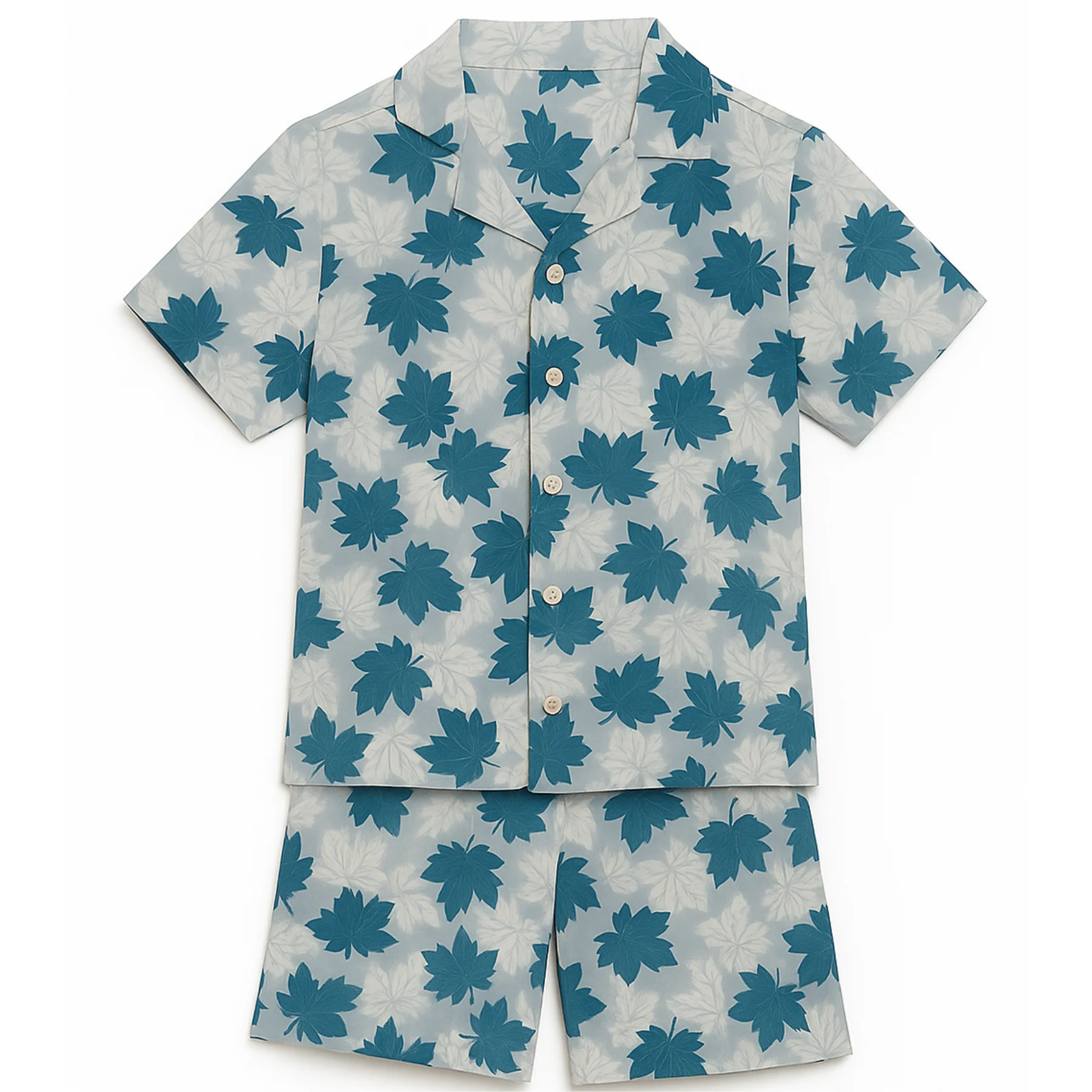 Bring refreshing holiday vibes to your child’s wardrobe with this Teal Leaf Printed Shirt & Shorts Co-ord Set for Boys. Designed with a soft grey base and bold teal leaf motifs, this outfit delivers a cool tropical look while keeping your little one comfortable all day long. Perfect for vacations, summer outings, birthday parties, casual playdates and everyday wear.