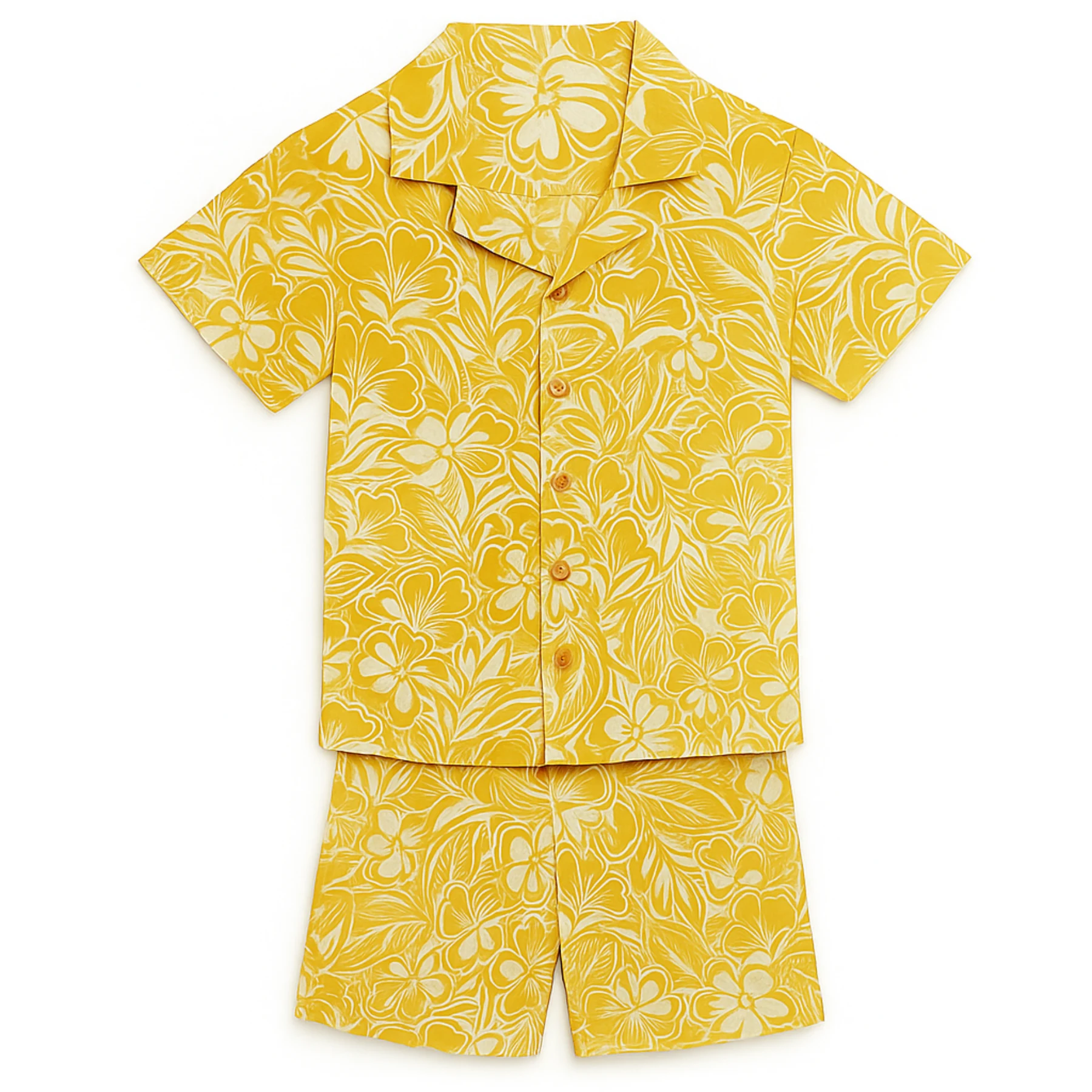 Give your little one the perfect blend of comfort and style with this Tropical Floral Yellow Shirt & Shorts Co-ord Set for Boys. Designed for sunny days and happy memories, this outfit features a vibrant all-over floral print inspired by tropical holidays. The soft, breathable fabric keeps kids cool and comfortable throughout the day, whether it’s a family outing, vacation, beach day, birthday party or daily wear.